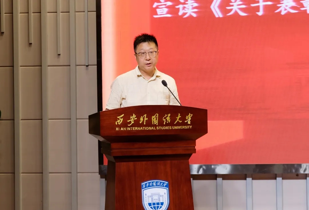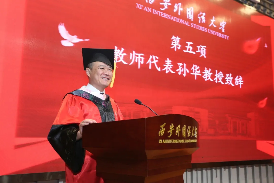 孙华教授代表学院全体老师为毕业生送上寄语,他希望毕业生们能够心地纯净,光明磊落;能够自由自在,保有一颗赤子之心。最后,他祝愿毕业生们好运常伴,迈向前程。希望同学们能够常回家看看,文苑南路6号永远是为西外学子敞开的家。