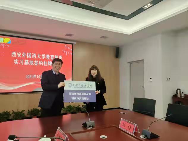 在大家的共同见证下,双方领导签署了合作协议,西安外国语大学基础教育高质量发展研究与实践基地在高新一中分校(高新区第三初级中学)正式成立。