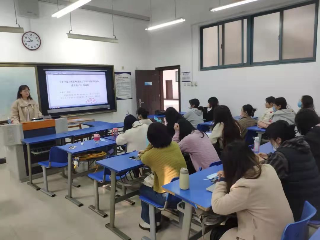 第二部分,带领全班同学认真学习《西安外国语大学违纪处分办法(修订)》,对各类违规违纪行为、处分办法进行界定分类,希望同学们在平日的学习生活中提高思想认识,规范行为,严格遵守校规校纪,争做新时代合格大学生。