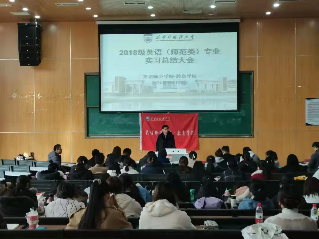 2018级英语(师范类)专业第一阶段实习总结大会在SD107举行,院长孙二军、副院长王嘉铭、党委副书记刘一静和全体实习带队老师及2018级辅导员老师受邀出席,大会由王嘉铭副院长主持。