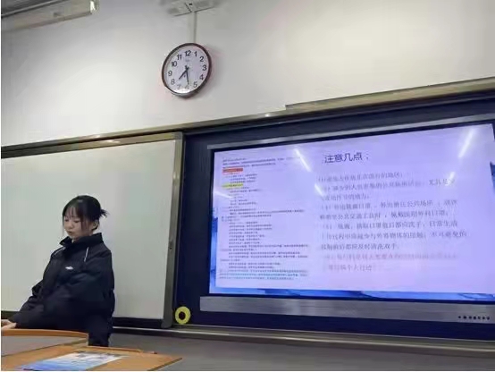 主题班会上,生活委员何佳乐同学从肺结核、流行性感冒、水痘和流行性腮腺炎等常见的秋冬季传染病相关知识为切入点,介绍了几种常见的冬季传染病的发病原因、发病症状和预防措施,引导大家养成良好的健康习惯。她重点强调了肺结核的预防,提示大家在冬季要重点预防肺结核这类呼吸系统疾病。在互动交流中,她针对冬季气候干燥易上火的问题向同学们介绍了“均衡饮食、适当滋补;坚持锻炼、调养身体;调整情绪、按时作息”三种改善调理的方法,希望同学们加强对于身体健康状况的关注。最后,何佳乐同学特别提示大家要继续配合好日常的疫情防控工作,提醒大家关注国内疫情防控情况,并提出“避免去疫情中高风险的地区”等六点注意事项,重点要求“每位同学每天都要在规定的时间内完成打卡,不要隐瞒个人行迹”,共同筑牢疫情防控长城。