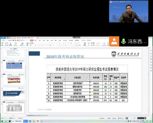 冯东副院长给学生们带来的考研指导讲座。冯老师通过研究生需求方的角度给同学们介绍了应该从哪几个方面准备考研。冯老师首先向大家强调了中国研究生招生信息网和该信息网的重要性,其次为同学们介绍了2022年英语师范学院研究生第一志愿报名,上线和录取情况。随后老师根据一览表的内容,为大家详细介绍了教育学近几年的招生情况,简单介绍了学硕与专硕的关系。冯老师向要考本学院研究生的同学们提出了一些非常切实可行的建议。