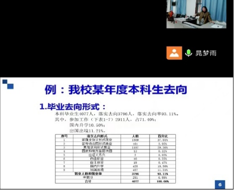第二场讲座是20级辅导员晁梦雨老师为同学们带来的职业规划讲座。晁老师通过数据分析为大家解读了往届本科生的就业总体情况,并给同学们分享了如何做好毕业准备的经验。晁老师鼓励学生们要有良好的心态,平时要合理规划好自己的在校时间,在学习知识的同时更重要的是掌握学习的方法,为未来就业做好充分准备。