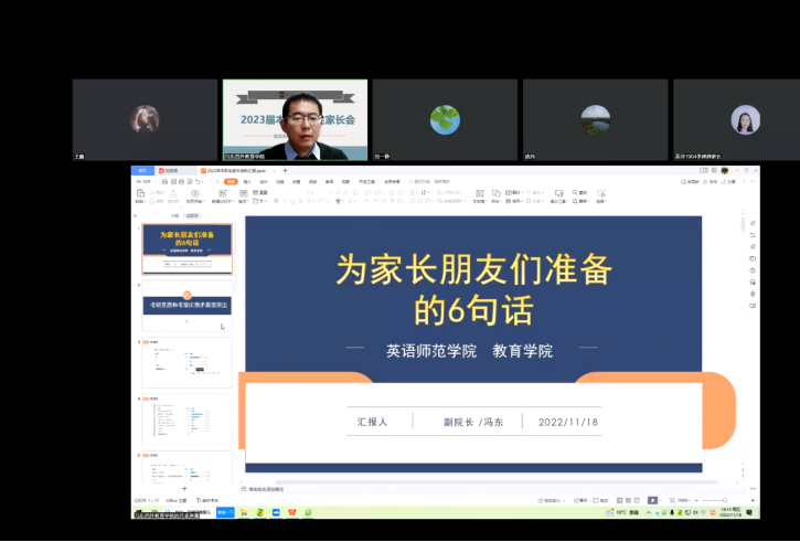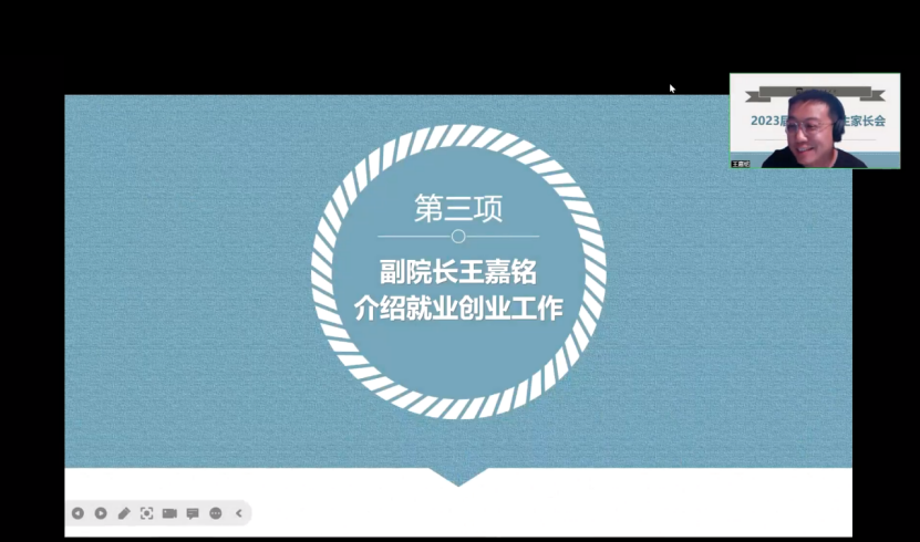 于11月18日晚7点召开了2023届毕业生线上家长会,院长孙二军、党委书记姚玮、党委副书记刘一静、副院长冯东、副院长王嘉铭、2023届本科毕业生辅导员王鑫以及往届毕业生代表、2023届毕业生家长参会。会议由刘一静主持。