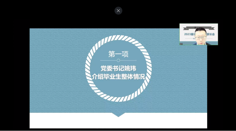 大会第一项,姚玮对各位家长线上参会表示欢迎,并对2023届学生整体情况进行介绍。他表示2023届毕业生人数为历届最高,就业形势严峻,希望通过此次家长会,学院能够和家长们一起切实关心孩子的就业,形成“家校携手,共促发展”的良好氛围,努力实现高质量就业。
