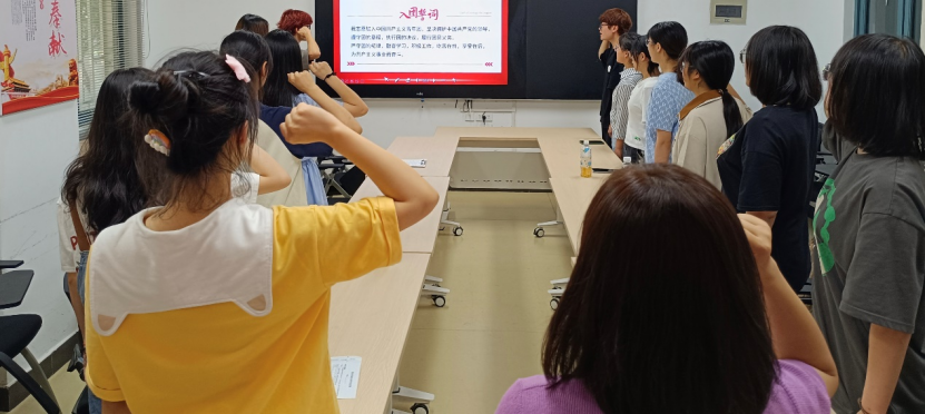 2022级4班团支部在思政进公寓—党团组织工作站举行了新发展团员入团仪式暨学习习近平总书记重要讲话精神主题团日活动。2022级辅导员李瑞静老师和2204班全体共青团员共同参加。