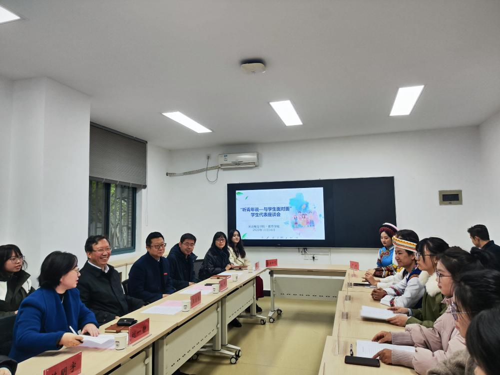 座谈会上,王启龙首先参加了所联系学生班级的座谈会,本科2022级英语(师范)专业4班学生代表从思想建设、学习规划、班级活动等方面做了工作汇报,汇报内容基于前期调研数据,充分展示了该班级团结进取的朝气和奋发向上的凝聚力。王启龙对该班级工作开展表示肯定,强调班集体建设对个人发展的重要性,嘱咐同学们要时刻树立集体意识,加强班级学风建设,在追求个人发展的过程中为班集体做出贡献,在大学生期间收获珍贵的班级友谊。