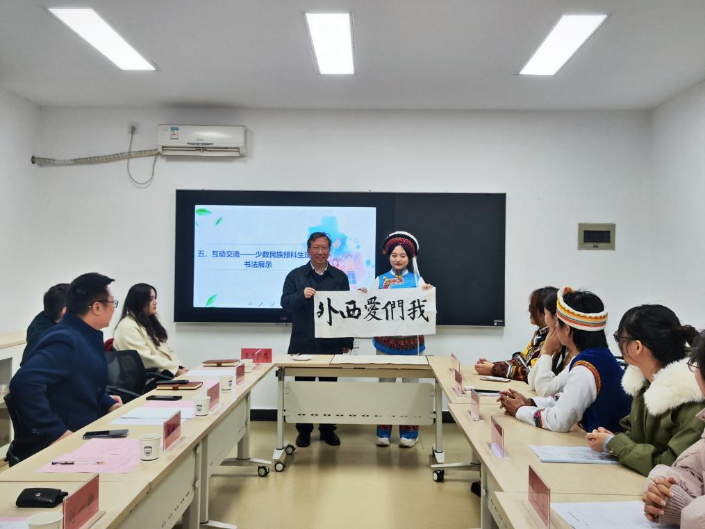 随后,王启龙还与同学们从学习、生活和成长等各方面面对面近距离交流,深入了解学生所想所需,并现场答疑解惑回应同学们的诉求。交流过程中,少数民族预科班学生代表庄妍还现场展示书法才艺,用“我们爱西外”书法作品表达对学校的热爱和感谢。