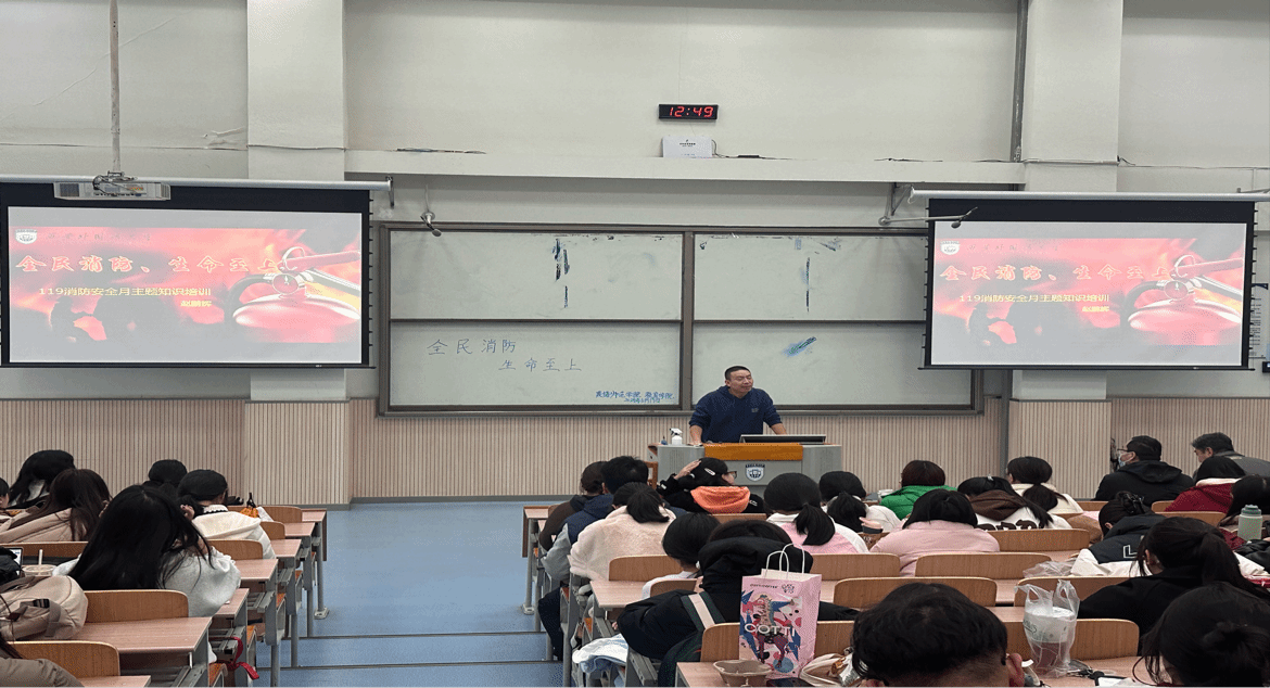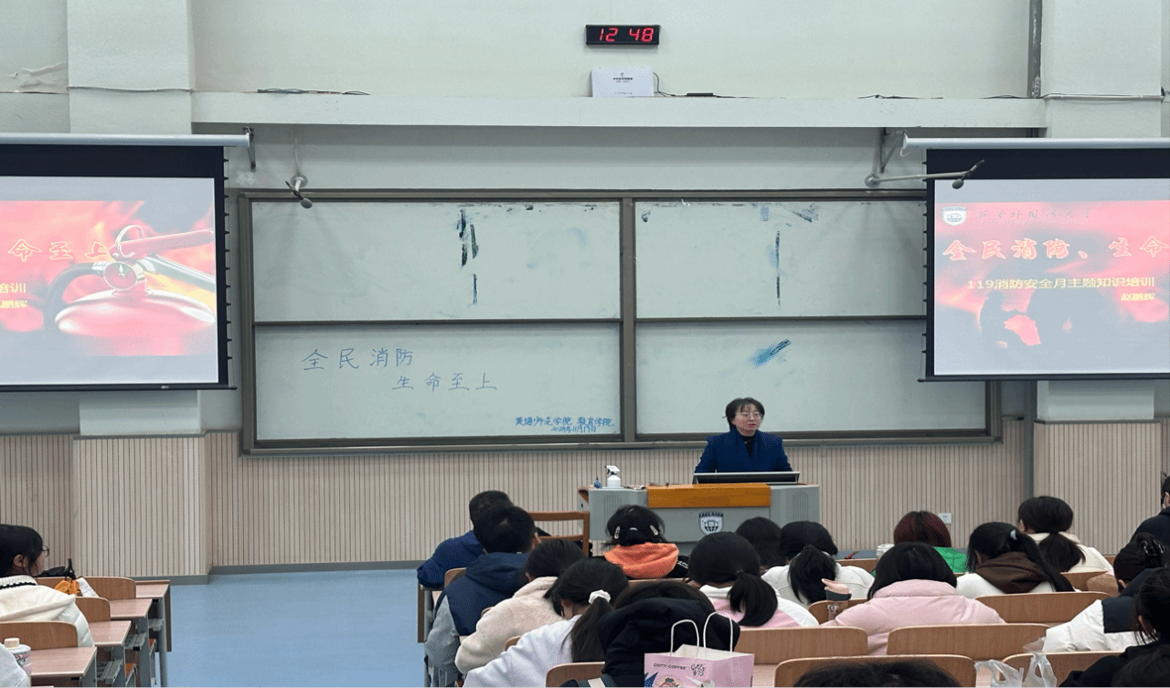 讲座伊始,刘一静向全体新生介绍了本次培训的目的以及消防安全对每个学生日常生活的重要意义,希望同学们能通过此次消防安全教育培训增强消防安全意识,提高紧急情况下的避险自救能力,并呼吁大家“关注消防安全,共建平安校园”。