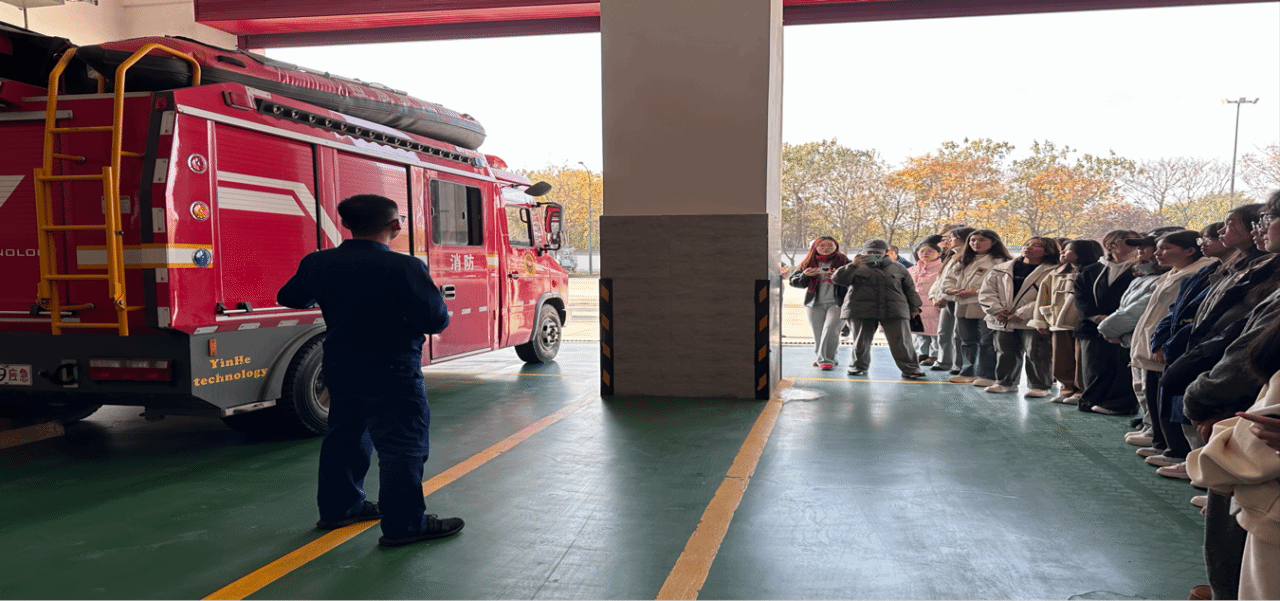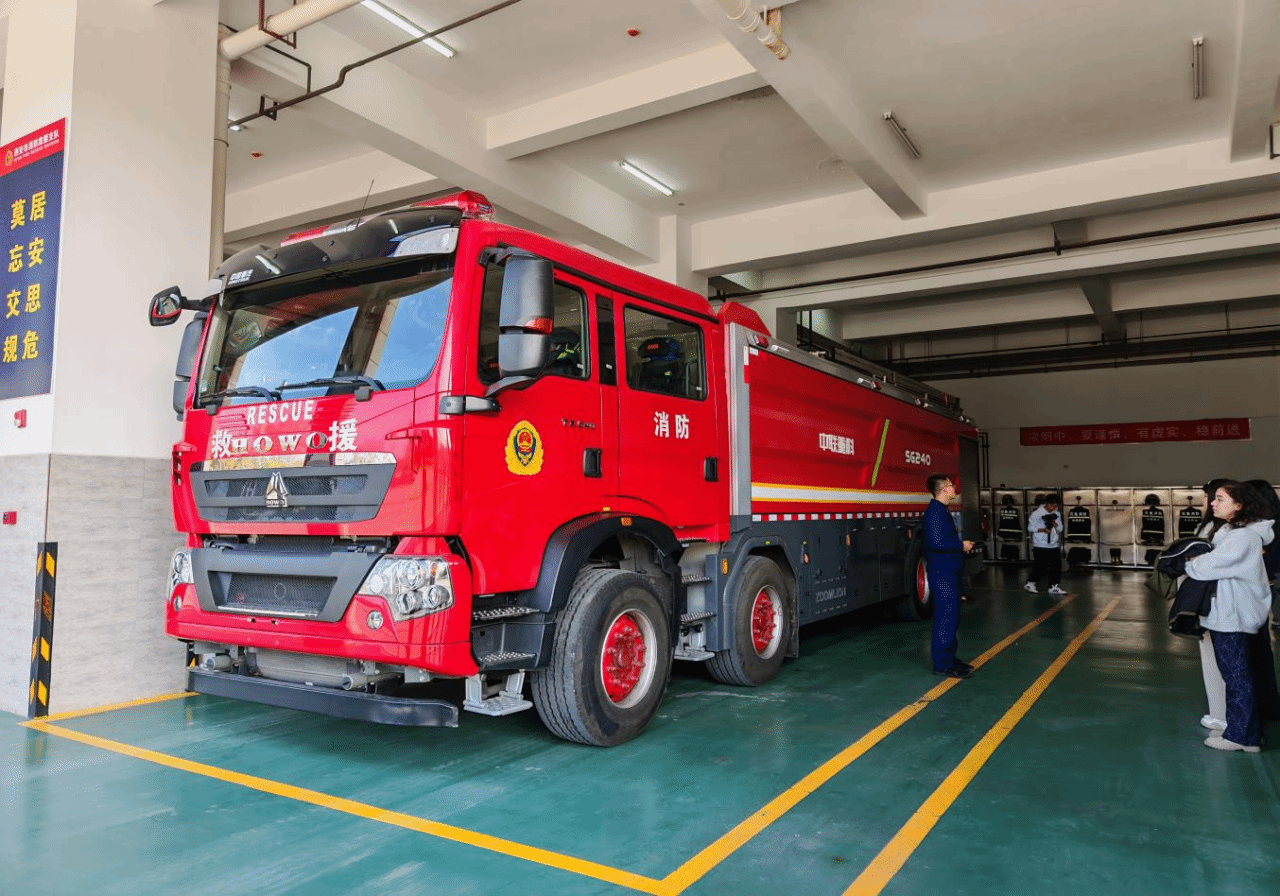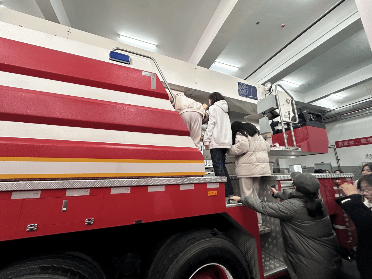 参观过程中,消防队员热情接待参访师生代表,首先向大家介绍了不同类型的消防车,如云梯消防车、水罐消防车等。每一辆消防车都像是一个移动的“消防堡垒”,车内配备了各种专业工具和灭火器材。消防员逐一介绍了这些设备的功能和使用方法,比如高压水枪如何在灭火中发挥强大的威力,云梯消防车如何快速帮助被困人员逃生等 。此外,同学们还登上云梯消防车,深入了解云梯的使用方法及功能。