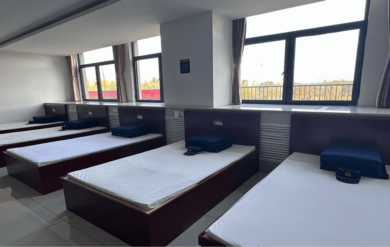 接着,学生走进消防员的生活区,整洁的宿舍、整齐划一的内务无不让人赞叹不已。被子叠得像豆腐块一样,物品摆放井井有条。这不仅展示了消防员们严谨的生活作风,更体现了他们纪律严明的队伍形象。在这里,大家了解到消防员们日常除了执行任务,还要保持高强度的训练和学习,随时为应对突发火灾做好准备。