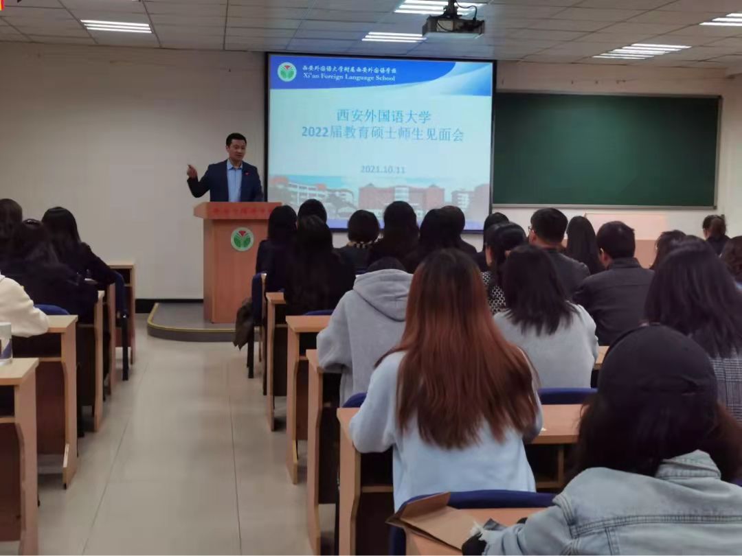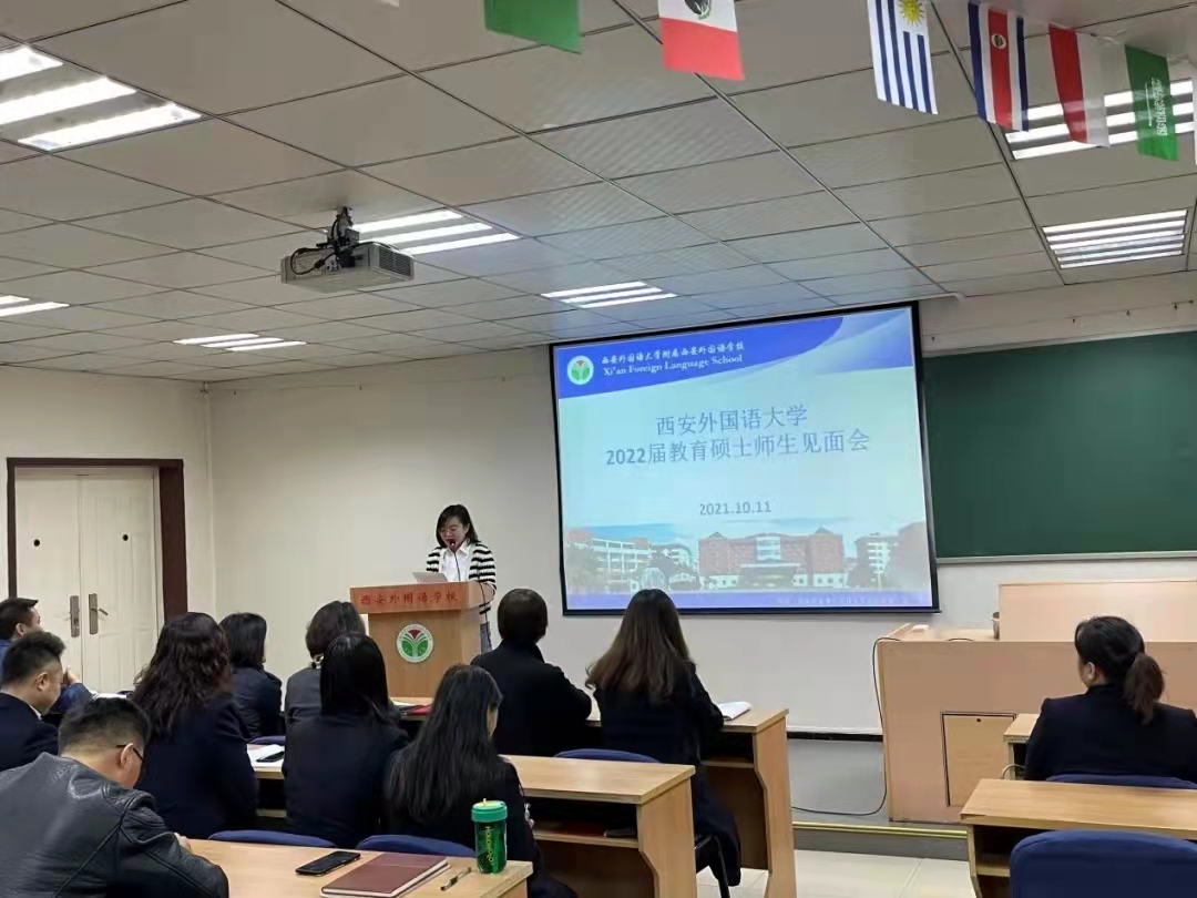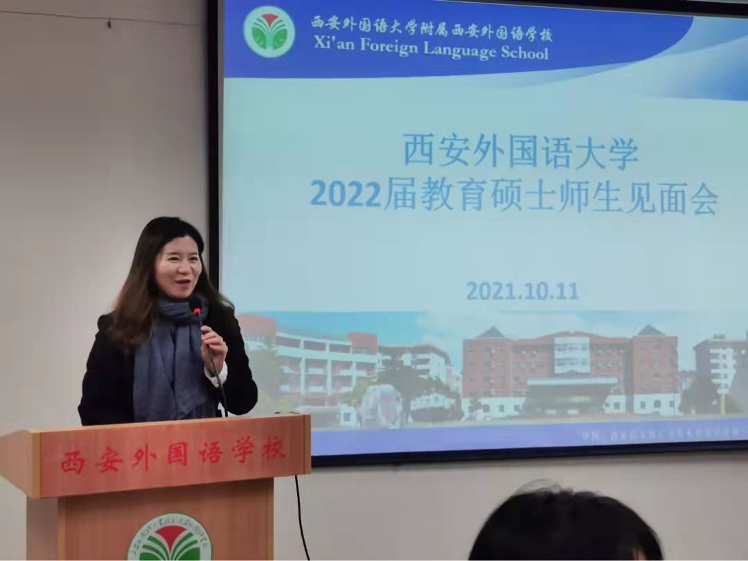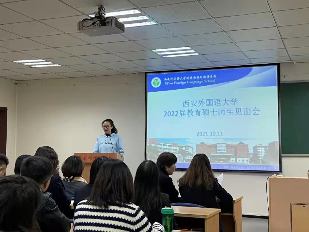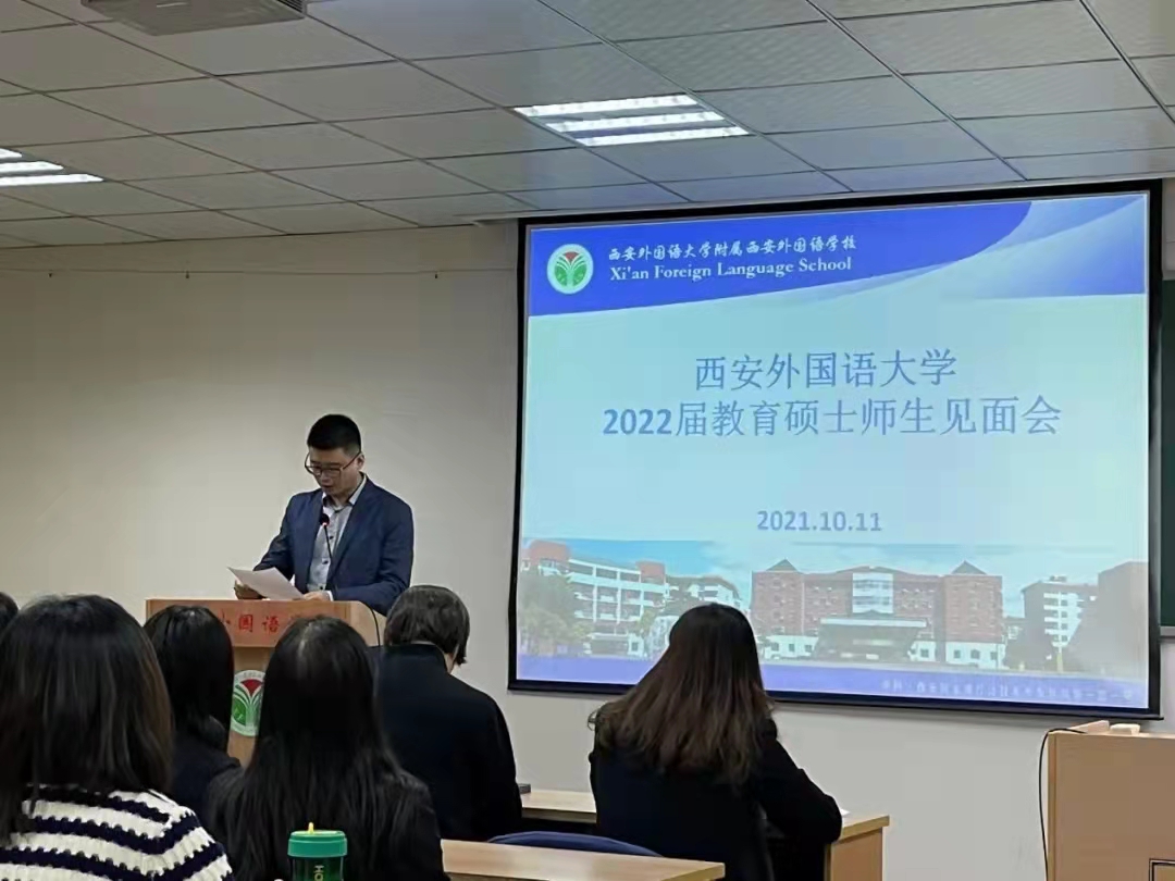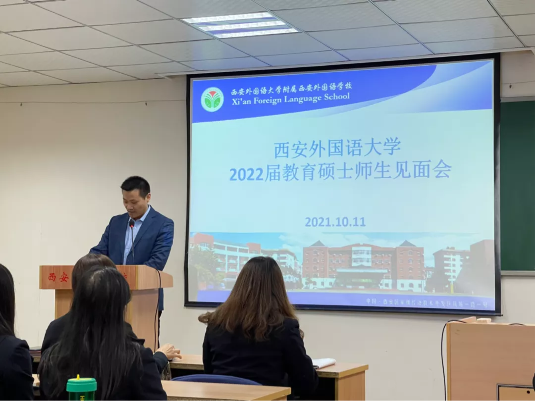 教育硕士实习工作安排,2021年10月11日下午2:30,在王毅敏老师和贾宁老师的带领下,27位2022届专硕研究生(高中部16人,初中部8人,小学部2人、教管1人)前往西安外国语大学附属西安外国语学校(西外附校),参加实习师生见面会。见面会由西安附校的教师发展•教学研究中心主任张先锋老师主持。