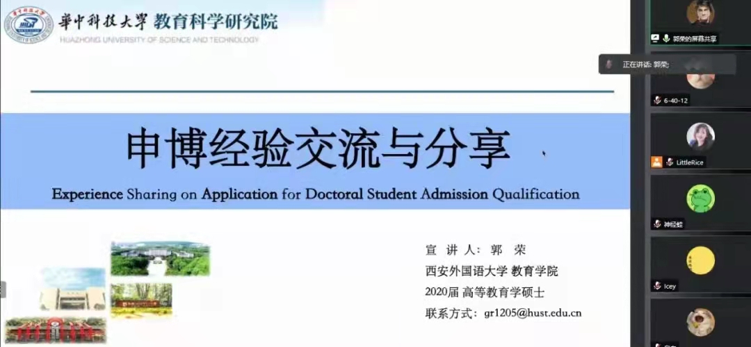 学风建设,为立志申博的学子答疑解惑,学院特别邀请了2020届高等教育学专业优秀毕业生郭荣于11月23日19:00通过腾讯会议线上举办申博经验交流与分享会。本次分享会由研究生辅导员薛璐主持,全体研究生参会。