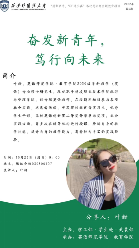 研究生做好职业规划,提升求职能力,学院特别邀请了2022届学科教学(英语)专业毕业生叶甜于10月23日9:00通过腾讯会议线上开展求职经验分享会。此次分享会为“朋辈互助,职通公寓”思政进公寓主题教育项目2022年第5期活动。会议由院研究生会生活权益部部长宋一丹主持,全体研究生参加。
