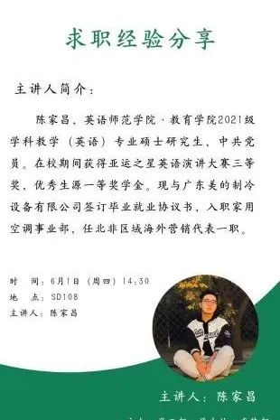 于6月1日14:30在SD108举办求职经验分享交流会。本次分享会邀请2023届硕士研究生王珺琳、陈家昌、王晶晶、张舒月、何媛媛进行经验分享,会议由研究生辅导员薛璐主持,全体研究生参加。