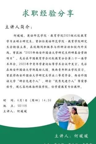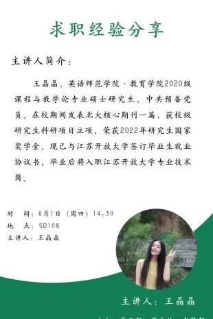 第五位分享的是2020级课程与教学论专业硕士研究生何媛媛,她结合自身求职经历,向大家介绍了签约中的注意事项,提醒大家面试时要谦虚有礼,不卑不亢,善于展现自己的长处,敢于接受自己的短板。