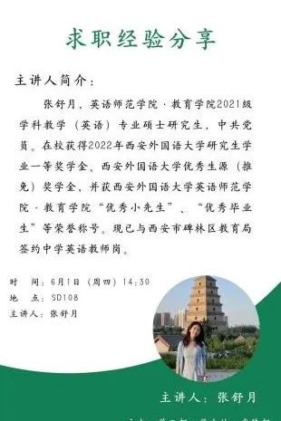 第四位分享的是2021级学科教学(英语)专业硕士研究生张舒月,她从求职准备、求职过程与求职心得出发,建议同学们抓住每一次机会并认真对待。在准备阶段,要制作主次分明、逻辑清晰的简历,同时还需提前了解应聘学校的相关信息,如校训、办学理念等。在求职过程中,要注重积攒实践经验,调整好心态,主动出击、积极争取,把握每次机会。