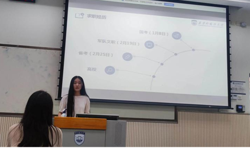 第三位分享的是2020级课程与教学论专业硕士研究生王晶晶,她结合自身备考公务员、军队文职、高校教师与行政岗的求职经历,向大家阐释了各个类别考试的内容与时间,她提醒同学们要尽早明确就业目标,充分利用各个微信公众号搜索就业信息,提早准备笔试与面试。