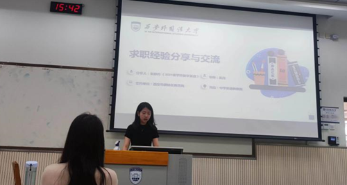 第一位分享的是2021级学科教学(英语)专业硕士研究生王珺琳。她从个人需求、抓住时机、面试准备、心态调整四方面出发,向大家细致介绍了公司面试的注意要点与常规问题,提醒大家明确职业选择,拓展就业渠道,关注就业信息,抓住秋招黄金期。