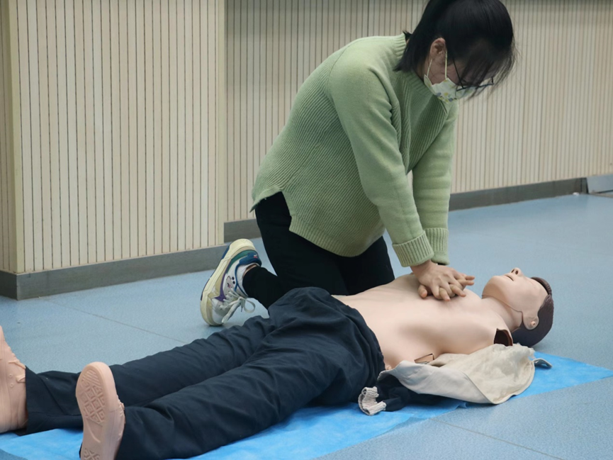 在明确急救时的具体要求后,校医院老师完整演示了心肺复苏术的正确步骤,部分同学积极参与练习,专业老师进行指导和补充建议。实训体验不仅增强了同学们对急救知识的了解,还提高了他们对突发事件的安全意识和处理能力,为筑牢安全防线提供了坚实保障。