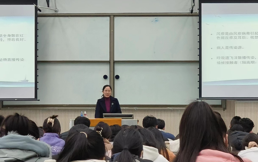 随后,汪瑛老师首先讲解了传染病的基本概念,重点对出血热、艾滋病、猴痘、结核病、流感等常见传染病的症状、传播途径、预防措施、易感人群等知识进行了详细介绍。汪瑛老师强调,秋冬季要格外注意饮食健康与个人卫生,做好个人防护并及时接种相关疫苗,宿舍和教室也应该保持通风与环境整洁。