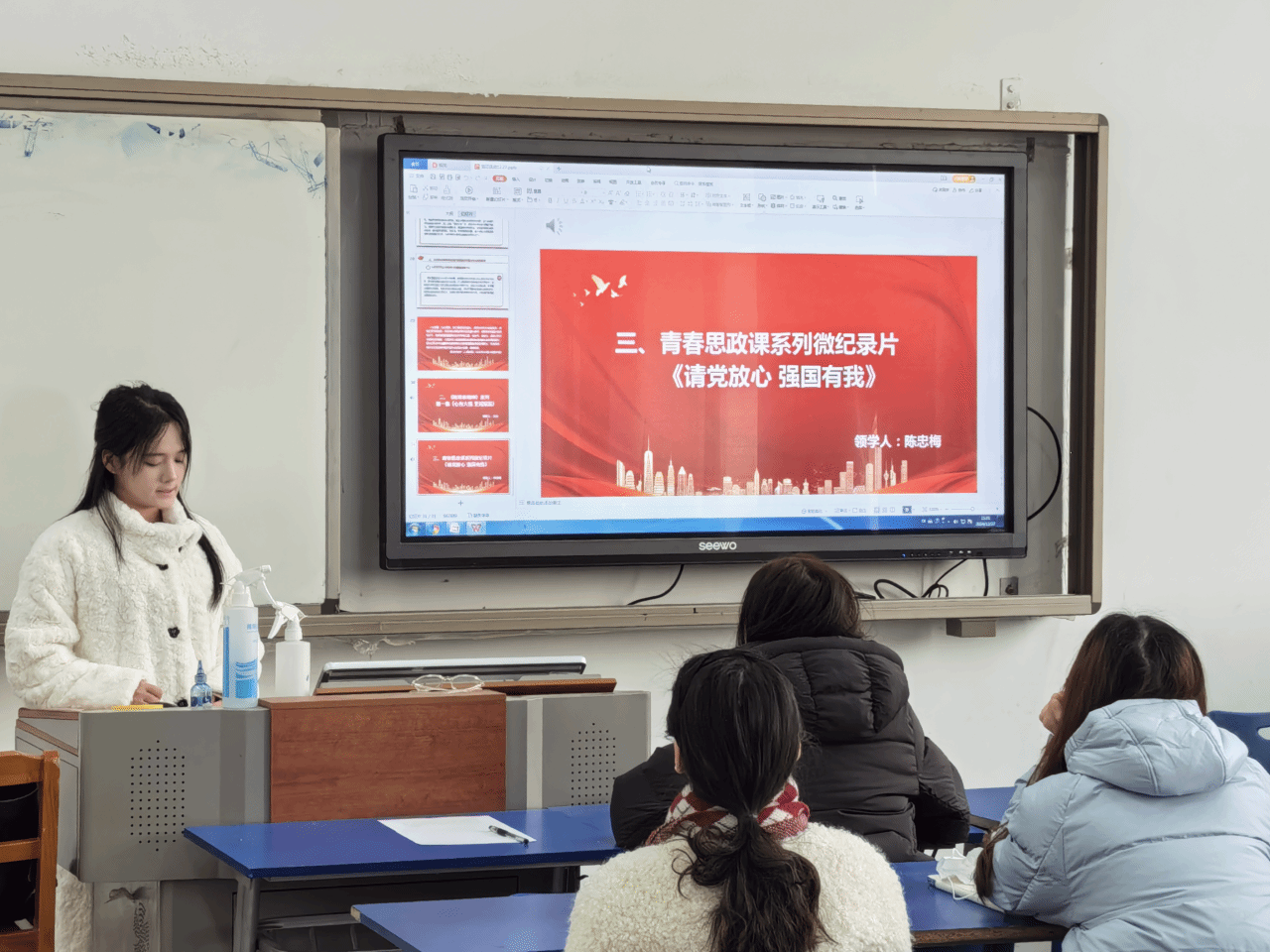 接着陈忠梅带领全体学生党员观看了《教育家精神》系列短片第一集《心有大我,至诚报国》以及青春思政课系列微纪录片《请党放心,强国有我》。