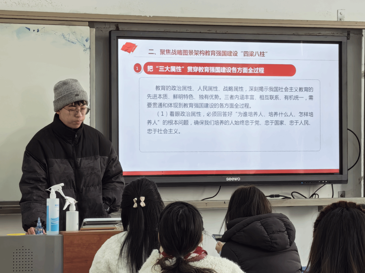 随后开展了“青春心向党,教育筑梦行”主题党日活动。首先,刘力带领全体党员共同学习了《奋力书写新时代新征程教育强国建设崭新篇章》。他从“增强加快推进教育强国建设的理论自觉与行动自觉”、“聚焦战略图景、架构教育强国建设‘四梁八柱’”以及“以改革创新精神推进教育强国建设重点任务落地见效”三个方面展开介绍。通过学习,全体党员深刻认识到了建设教育强国的重大战略意义,同时明确了自身的任务和努力方向。