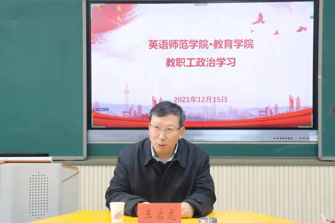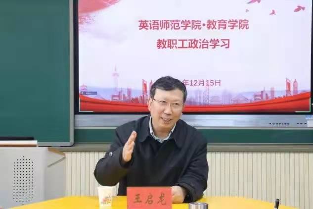 12月15日,王启龙同志来到英语师范学院·九州娱乐官网 ,用整个下午向学院全体教职工宣讲全会精神,为师生党员讲授了一堂生动的党课,参加指导学院党委理论学习中心组学习会。党课采用线上线下相结合的方式开展。