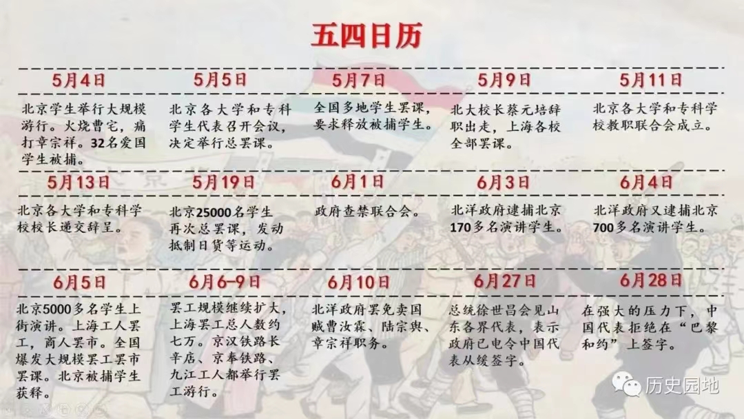 这张五四日历清楚地记录了两个月以来五四运动的发展和走向。可以想见,若没有这样的日复一日的斗争与强压,政府还能拒绝在巴黎和会上签字吗?拒绝签字,就是五四运动斗争的第一个成果。