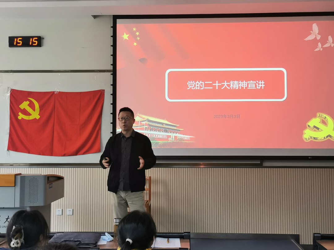 姚玮以“党的二十大精神”为主题,从“二十大的重要意义”、“二十大报告的产生”、“二十大报告的内容”、“如何了解二十大报告”等几个方面,紧紧围绕党的二十大报告的核心要义和深刻内涵,全面系统深入地解读了党的二十大报告提出的新思想新论断、作出的新部署新要求,深刻阐述了学习宣传贯彻党的二十大精神的重要意义。姚玮指出,党的二十大之所以如此重要,是因为这是我们党在建党百年后召开的首次全国代表大会,也是在新时代10年伟大变革的时间坐标上召开的全国代表大会,具有特别的里程碑意义。希望全体青年学生认真学习党的二十大精神,将党的二十大精神融入日常学习工作与生活中,做有理想、有追求、有担当、有作为、有品质、有修养的大学生,扛起新时代赋予青年学生的使命和担当,做新时代中国特色社会主义事业的合格建设者和接班人。