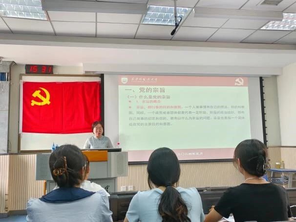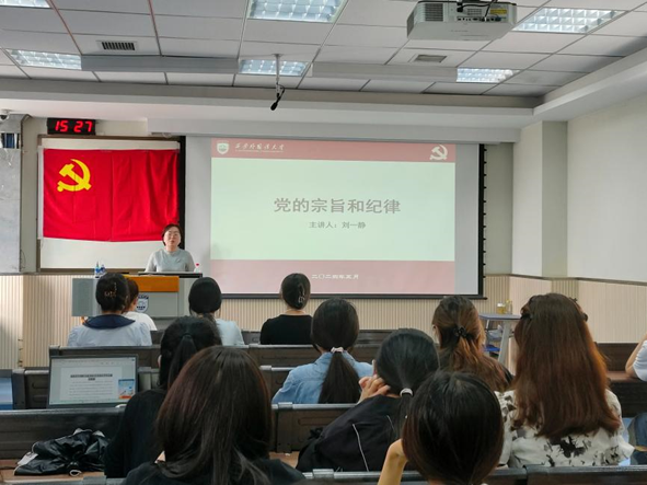 首先,刘一静带领全体党员从概念、由来、特点、意义等深入学习党的宗旨,深刻理解其丰富思想内涵,充分认识增强宗旨意识的意义所在,秉承为人民服务的宗旨,落实好公仆意识、为民情怀、担当精神,努力提高为人民服务的本领。随后,刘一静详细解读了党的“六大纪律”,即党的政治纪律、组织纪律、廉洁纪律、群众纪律、工作纪律、生活纪律,并结合自身学习、工作和生活与支部党员进行研讨交流。党课最后,刘一静向全体党员提出希望:一是要珍惜机会,认真学习,充分发挥党员先锋模范作用,真正做到学有所思、学有所无、学有所获;二是要严明纪律,做好示范,自觉维护好学生党员的良好形象,认真履职、实干担当;三是要牢记责任,学以致用,全身心投入到学习培训中,端正学风,潜心琢磨,将党课精神学深悟透。