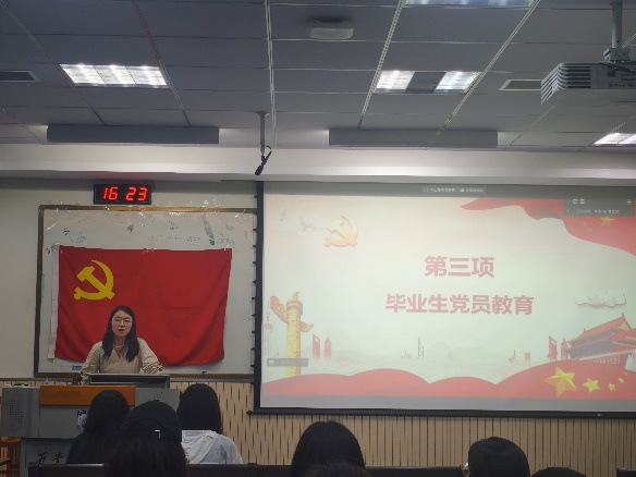 随后开展了毕业生党员教育主题会议。薛璐对毕业生党员档案转接及党组织关系转接的类别、操作流程、注意事项等进行了详细解读。此外,她还对支部全体毕业生党员顺利毕业表示衷心的祝贺,希望大家在工作岗位上仍能保持先进性,发挥党员的先锋模范作用。最后由毕业生党员代表赵敏发起文明离校倡议,号召毕业生党员在离校之际,做到平安离校、文明离校、温暖离校。