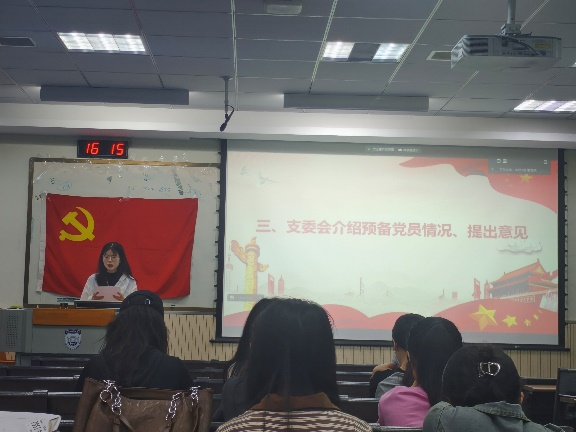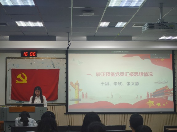 首先进行支部预备党员转正会议。三名预备期满的预备党员(李欣、张文静、于甜)从思想、工作、生活等方面对自己在预备期间的表现进行了汇报,其入党介绍人介绍了她们在预备期间的表现并发表意见。支委会对三名预备党员的审查情况进行汇报,并提出意见。听取报告后,支部大会充分讨论、发表意见并由正式党员进行无记名投票表决,全票通过了于甜、李欣和张文静三名同志的转正申请,同意其按期转正。最后全体党员重温入党誓词,回顾入党初心,坚定理想信念,并以此为契机,加强理论学习,提高专业素养,坚定为党和国家的伟大事业不懈奋斗。