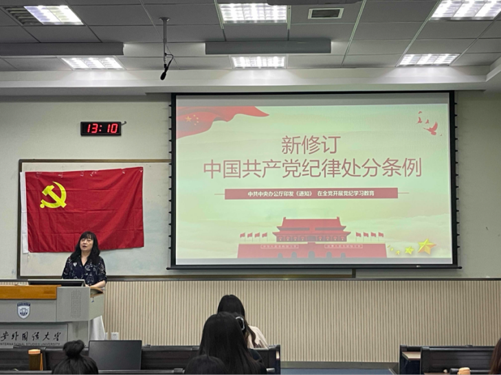 在开篇环节,李锐老师介绍了学习新修订《中国共产党纪律处分条例》的重要性。她说到,党纪处分条例作为规范党组织和党员行为的基础性法规,对确保全党在政治立场、政治方向、政治原则、政治道路上与以习近平同志为核心的党中央保持高度一致,具有极其重要的意义。她进一步阐述了学习《条例》的必要性,强调党员同志们应当深入了解其内容,并回顾党史,从中汲取经验,明确作为党员应当如何行动。随后,李锐老师深入解读了《条例》的修订意义及其执行要求。她讲到,学习《条例》不仅要掌握其核心要义,更要明确概念,确保学习准确,达到实效。她鼓励大家继续深化对理论内容的学习和理解,提高理论素养。最后,李锐老师对《条例》的内容进行了全面解读,介绍了六大纪律的具体内容以及违反纪律的相应处分。她强调,党员同志们应不断加强自身的政治理论学习,确保在思想上政治上行动上始终与党中央保持高度一致。