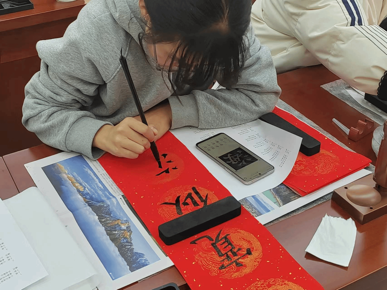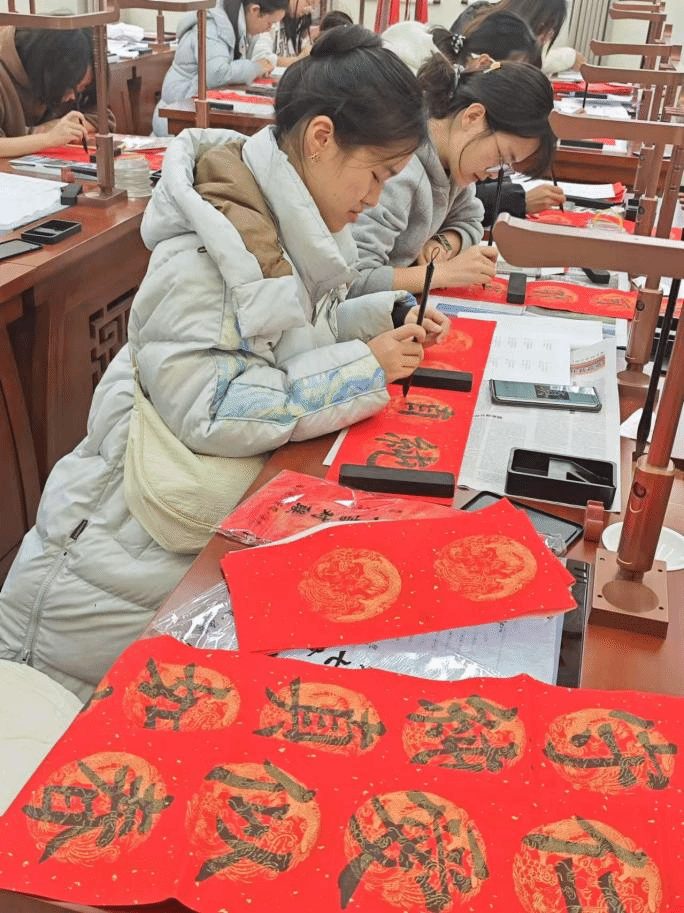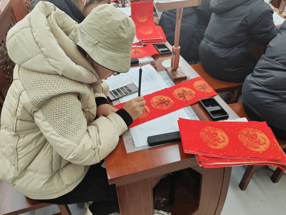 当同学们铺展红宣纸,蘸饱墨汁,挥毫落纸的瞬间,整个世界仿佛都安静了下来。一笔一划,一撇一捺,皆是专注与用心的倾注。从构思春联的内容,到精心雕琢每一个字的形态,这个过程如同一场心灵瑜伽,将平日里的浮躁与焦虑悄然驱散。书法本就是一种极具治愈性的艺术形式,它要求书写者心无旁骛,沉浸在笔画的起承转合中,忘却外界的纷扰与压力。每一次运笔,都是一次与内心的深度对话,在横竖撇捺间,同学们找到了内心的宁静港湾,让被快节奏生活扰乱的心灵得到了片刻的休憩与舒缓。