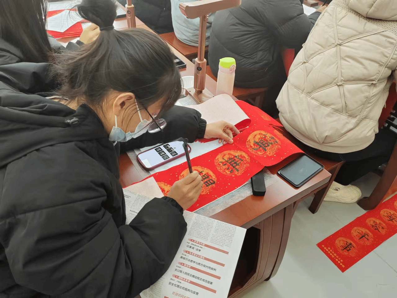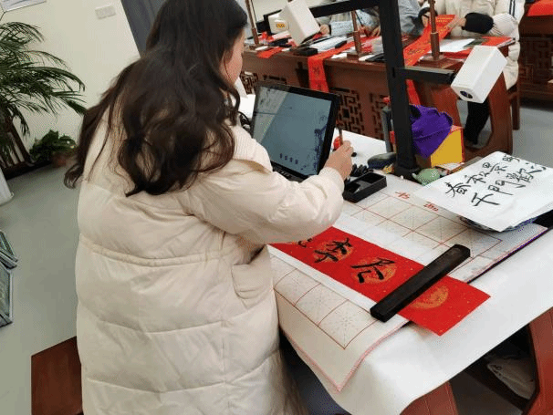 兼职辅导员吴佳佳老师也来到了活动现场,为同学们加油打气,同时她也参与到了书写春联的队伍中,为本次活动增添了精彩的一笔。