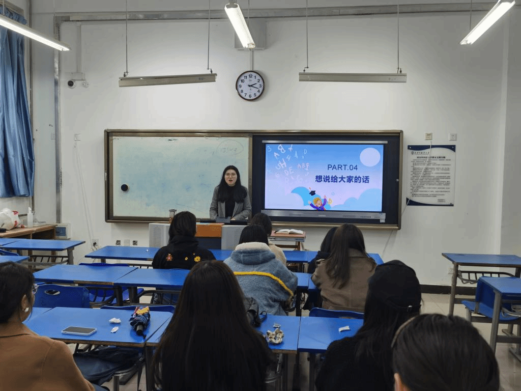 兼职辅导员白蓉蓉以及王滋雨分别就自己的实习经验以及研究生经历与同学们进行了分享。白老师叮嘱同学们在即将开启的实习工作中,一定要重视疫情防控工作,关注天气变化,注意保暖。接着,白蓉蓉向同学们介绍了近期实习和就业工作一些基本问题,同时指出毕业季更要端正心态、坚定信念,并就同学们的疑惑进行现场答疑,会场气氛活跃,师生互动良多,同学们纷纷表示受益匪浅。兼职辅导员王滋雨就学院实习工作、毕业生春招及就业工作、校内外安全工和网络意识形态等的相关工作对学生们提出了更高的要求,并呼吁同学们应时刻关注社会形势,积极高效地获取就业的相关信息。最后,王老师希望大家在毕业进行时的路上,能将三年所学知识转化为实践,在毕业时都有一个好的归宿和着落。