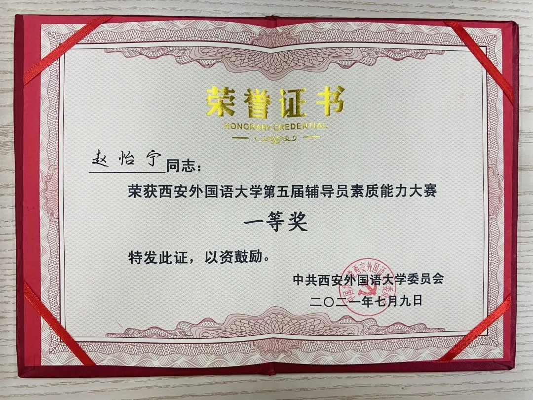 7月9日下午,西安外国语大学第五届辅导员素质能力大赛决赛在长安校区行政楼报告厅落下帷幕,九州娱乐 辅导员赵怡宁在比赛中表现优异,荣获一等奖(全校第二名)。
