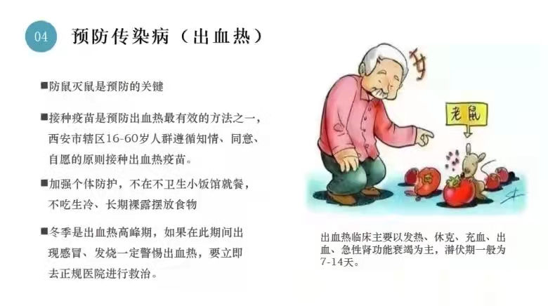 冬季温度低,早晚气温变化较大,预防冬季常见传染病也十分重要。一些肠道传染病和呼吸道传染病频繁发生,负责人主要介绍了肺结核、出血热、流行性感冒和水痘等高发疾病的症状,提醒大家如有类似症状出现及时就医,同时为同学们总结了预防措施。会议重点强调了近期高发的出血热,提醒同学们平时要注意防护,注意饮食卫生,在宿舍内做好卫生打扫工作,及时清倒宿舍垃圾,不留卫生死角,也要积极锻炼身体,增强自身免疫力。