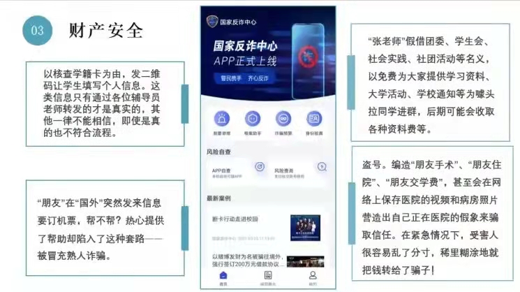 在财产安全方面,负责人薛佳艳同学用自己的亲身经历为我们敲响了网络诈骗的警钟。网络诈骗无处不在,我们要时刻保持警惕。对于那些自称熟人或朋友介绍的人,要学会“听其言,查其色,辨其行”。不贪小便宜,时刻牢记天下没有免费的午餐。同时提醒大家安装国家反诈中心APP。
