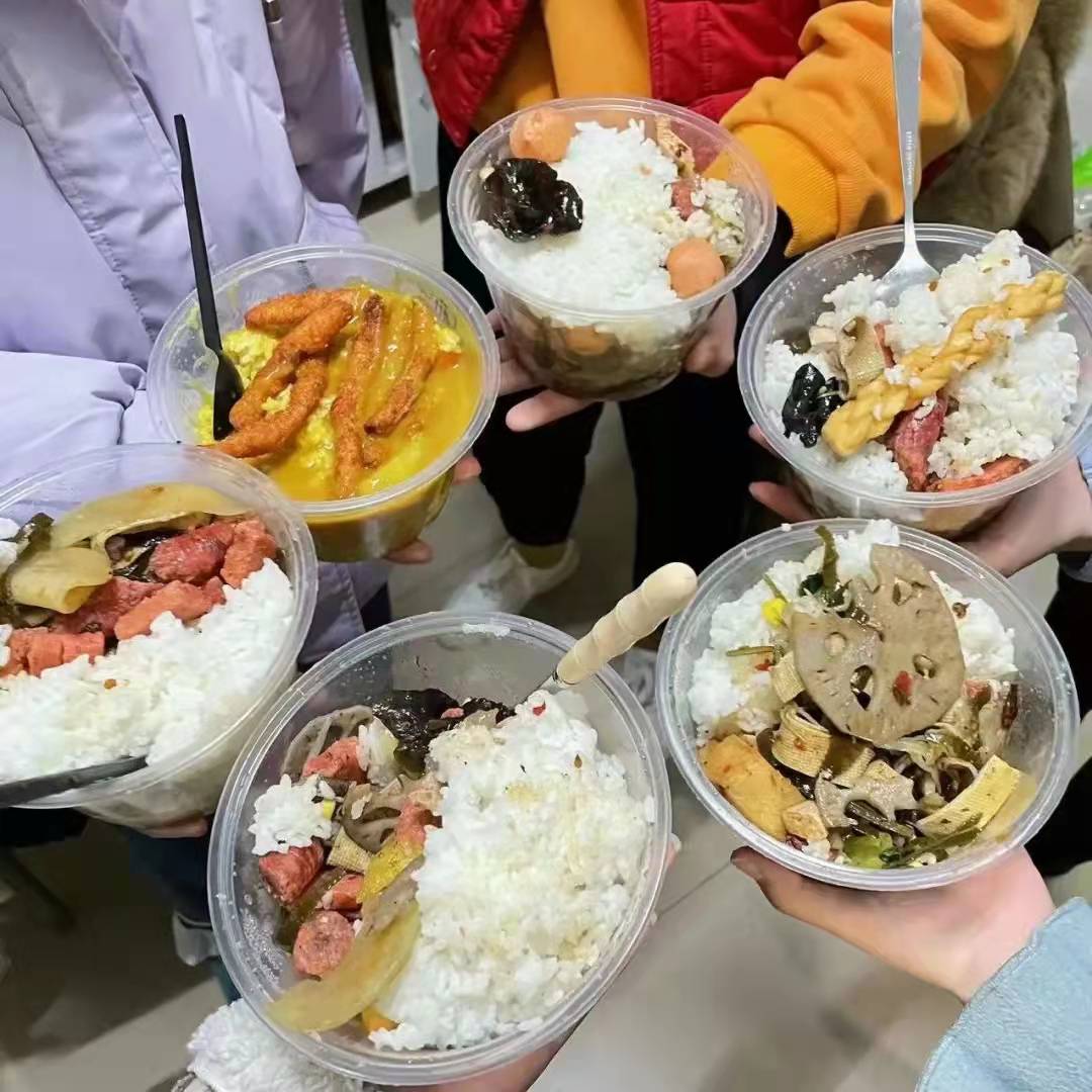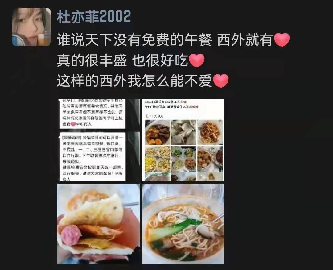 这顿午饭,是我们在西外吃过的最可口的佳肴。它虽然不是什么山珍海味、满汉全席,但是尝起来却比它们都要香甜暖胃。它将每个人的爱融化其中,形成一种无形的力量,使我们在这个寒冬、在这个疫情下像火一样热情。