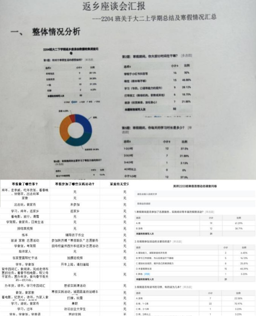 会前,李瑞静老师通过走访宿舍、个别谈话、班级调查问卷等形式开展调研,全面了解学生返校后的思想和心理状况,通过细致地谈话和科学地数据分析,为开展返乡座谈会做好充足准备。