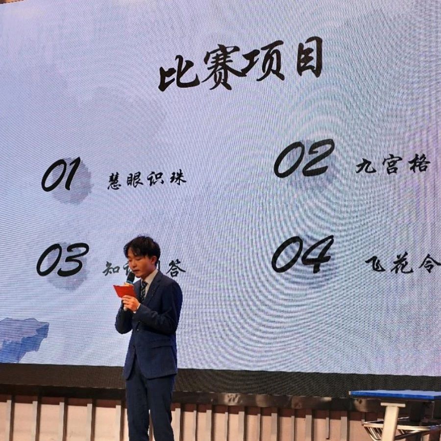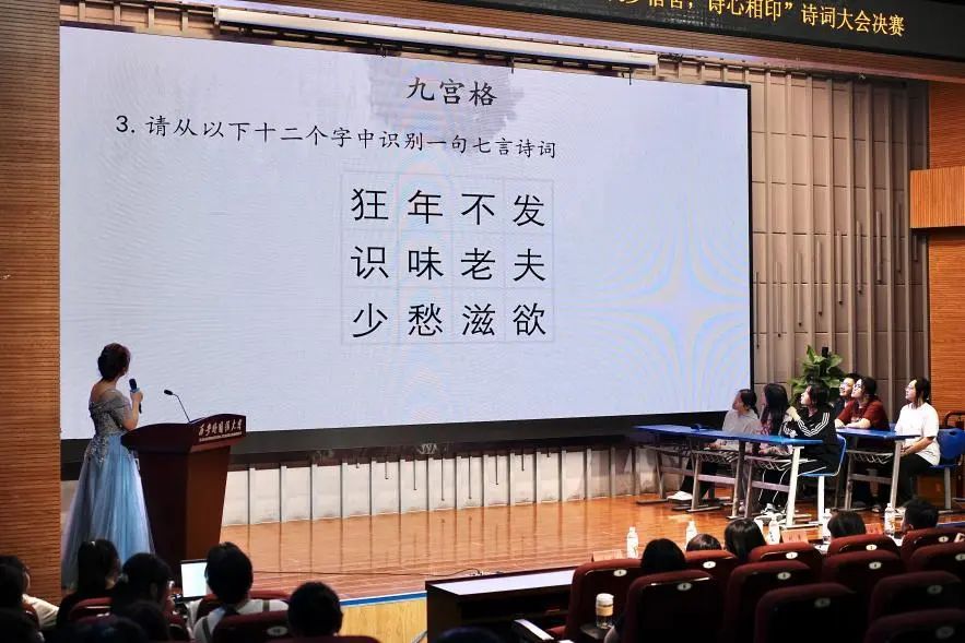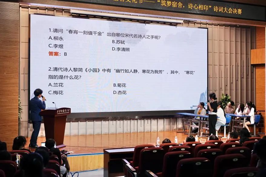 随后,伴随着主持人的热情开场和参赛队伍的趣味介绍,诗词大会决赛正式开始。本次决赛共分为两轮,第一轮分别为慧眼识珠、诗词九宫格和知识问答。晋级第二轮的宿舍进行飞花令比拼。
