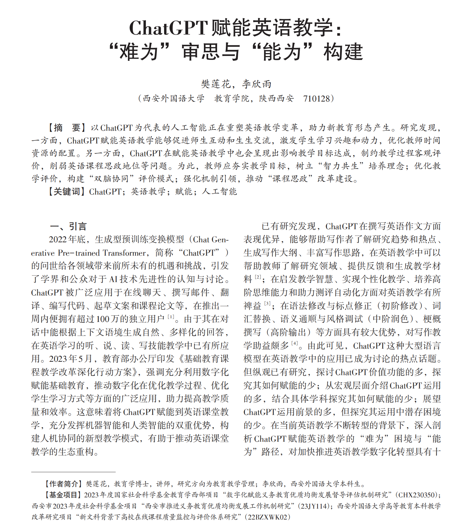 学院2021级本科生李欣雨与教师樊莲花博士携手在学术期刊《中小学课堂教学研究》上发表了题为《ChatGPT赋能英语教学:“难为”审思与“能为”建构》的学术论文。该文章凭借深刻的学术见解和前沿的视角,被中国人民大学书报资料中心复印报刊资料《中学外语教与学》于2024年第6期全文转载,收获广泛的学术传播价值和影响力。