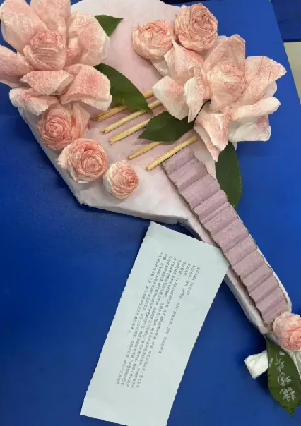 在造型设计上,作品以琵琶为原型,将其独特的梨形琴身、琴颈、琴头结构用手工形式呈现。在保留琵琶基本形态的基础上,用粉色为主色调,赋予作品柔和甜美的风格。用抽纸做出花朵并染成粉色然后用绿叶进行装饰,花朵的形态与琵琶的古典气质相呼应,增添了作品的艺术美感和浪漫氛围;绿叶起到点缀和平衡色彩的作用。粉色调的运用突破了琵琶传统的色彩印象,作为传统乐器琵琶的创意呈现形式,可用于文化展览、校园活动等,向大众尤其是青少年展示传统乐器之美,助力传统音乐文化传播与传承。