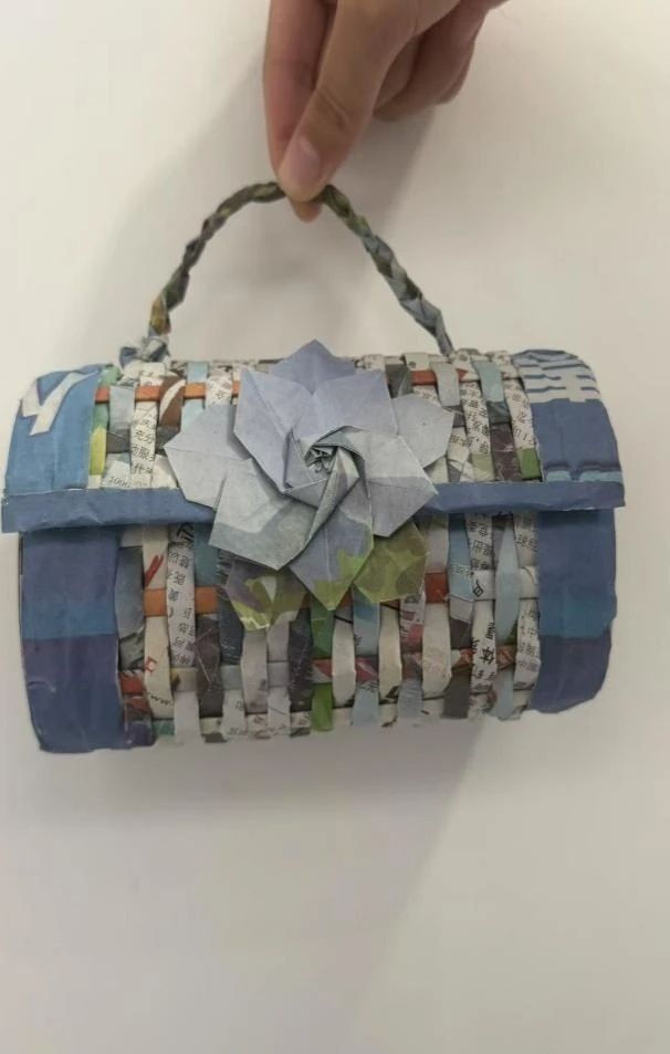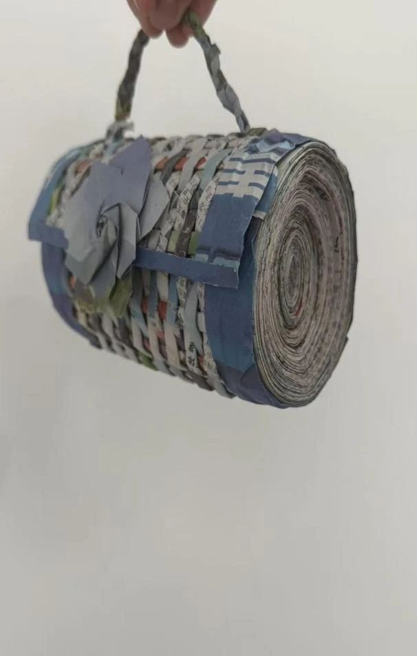 这件作品采用废旧报纸作为原材料,并通过编织工艺精心制作。“再”字突显了材料的二次利用特性,彰显了环保理念。这些曾经记录新闻时事、反映生活百态的报纸,虽然已经完成了它们的初始使命,看似无用,但在这里,它们摆脱了被丢弃的命运,实现了一次华丽的蜕变。它们将被重新编织,赋予新的生命,讲述环保与艺术交融的新故事。经过编织和折叠,报纸展现出了很高的韧性,使得这件作品不仅具有观赏性,还兼具实用性,可以在日常生活中使用。