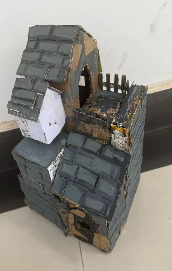 本作品使用快递纸盒,通过裁剪和拼接构建立体框架,保留纸盒原有折痕作为建筑肌理,赋予作品岁月质感。选用国画颜料中的多种色彩,分别晕染墙面、屋顶与窗棂,再以墨线勾勒瓦当、门框细节,使平面色彩在立体结构上形成层次递进,实现传统绘画意境与现代手工创作的融合。作品以质朴的材料转换与直观的艺术表达,诠释对生活美学的观察:将废弃物转化为承载情感的空间符号。既传递资源循环利用的环保理念,也展现平凡事物经创意重构后的诗意可能。小筑的存在不仅是手工技艺的呈现,更意在唤起对日常场场的再审视——当标准化的快递包装被赋予色彩与温度,快节奏生活中的“废弃物”亦能成为慢时光里的艺术注脚,印证生活之美源于对细节的珍视与想象。