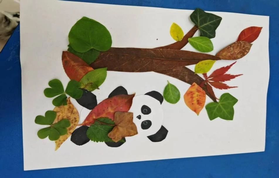 这幅树叶拼贴画细腻地勾勒出一幅秋日的温馨画卷。画面中,一棵粗壮的树干由深棕色材料精心构建,其上繁茂的树枝优雅地伸展,枝头层层叠叠,尽是红与绿交织的秋叶,相互映衬,自成一幅绚丽的画卷。这不仅是秋天独有的绚丽调色盘,更在其间巧妙点缀着几片樱花,轻盈舒展,为画面增添了一抹别样的柔美。画面一侧,一只憨态可掬的熊猫悠然自得,其黑白分明的毛色简洁而经典。它似乎正专注地摆弄着手中秋叶,周围散落的叶片营造出一种悠然闲适的氛围,让人仿佛能听到秋叶在熊猫手中轻轻沙沙作响的声音。通过这一作品,我们不仅表达了对国宝等稀动物的深切关爱,也传递出对自然的深深敬畏。拾起落叶进行创作,是让“生命”以另一种形式延续,让人们在欣赏作品时,意识到人与自然和谐共生的重要性。让我们珍视身边的一草一叶,共同守护我们宝贵的生态家园,让自然的美丽与和谐得以永续传承。