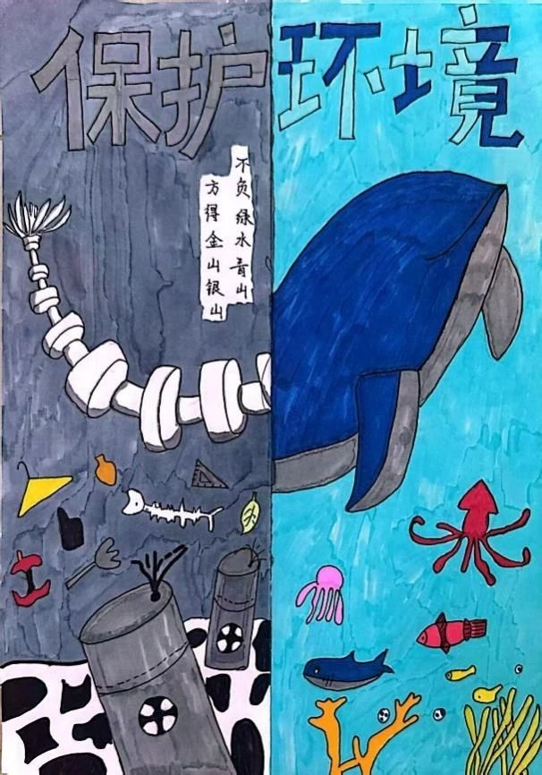这幅画以独特的分割构图,展现了海洋的两种截然不同的景象。画面左侧以灰色调为主,呈现出海洋生态被破坏的惨状。鲸鱼的骨架象征着海洋生物因污染而消逝,核废料桶、鱼骨、塑料垃圾等元素,揭示了人类活动给海洋带来的沉重灾难,如核污染、过度捕捞、塑料垃圾泛滥等问题,这些都在无情地摧毁海洋生态平衡。画面右侧则是一片生机勃勃的蓝色海洋。健康的鲸鱼在清澈的海水中遨游,周围环绕着五彩斑斓的珊瑚、灵动的小鱼和其他海洋生物,代表着海洋原本的美丽与和谐。画作上方“保护环境”四个大字点明主旨,传达出保护海洋环境刻不容缓的强烈呼吁。中间“不负绿水青山,方得金山银山”的文字,进一步强调了只有守护好自然环境,才能实现可持续发展,让人们认识到保护海洋环境不仅是为了海洋生物,更是为了人类自身的未来。