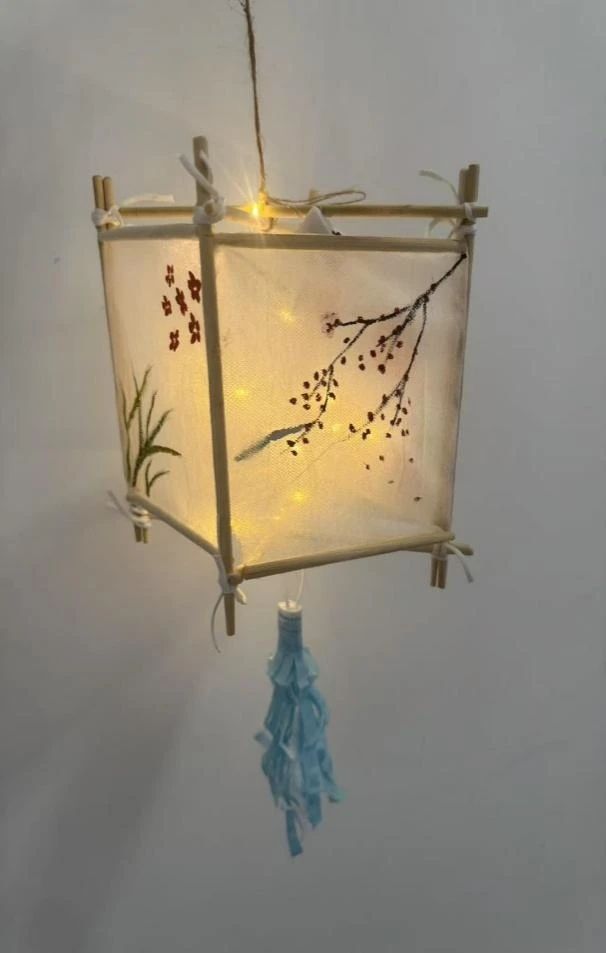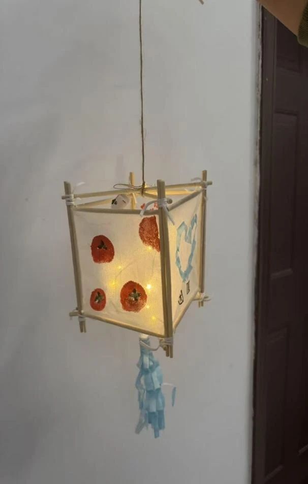 作品巧妙地将废弃口罩转化为灯笼的四个面,并用流苏和花朵装饰,结合竹篾支架和口罩耳挂绳固定,通过剪裁和固定等精细手法,打造出一款既环保又具有装饰性的灯笼。作品的创意亮点在于材料创新,选用口罩的无纺布,其透光性柔和且经过消毒处理后可安全再利用;结构巧思体现在流苏和花朵由口罩和耳挂绳制成,既美观又实用;文化融合则通过灯笼象征团圆,赋予废弃品新的温暖寓意。这款灯笼不仅可作为家居氛围灯、节日装饰或环保教育的展品,还响应了世界地球日的主题,倡导“变废为宝”的可持续生活方式,通过手工艺传递资源循环利用的绿色理念,让环保意识如灯光般照亮我们的生活,提醒我们珍惜资源,保护环境。
